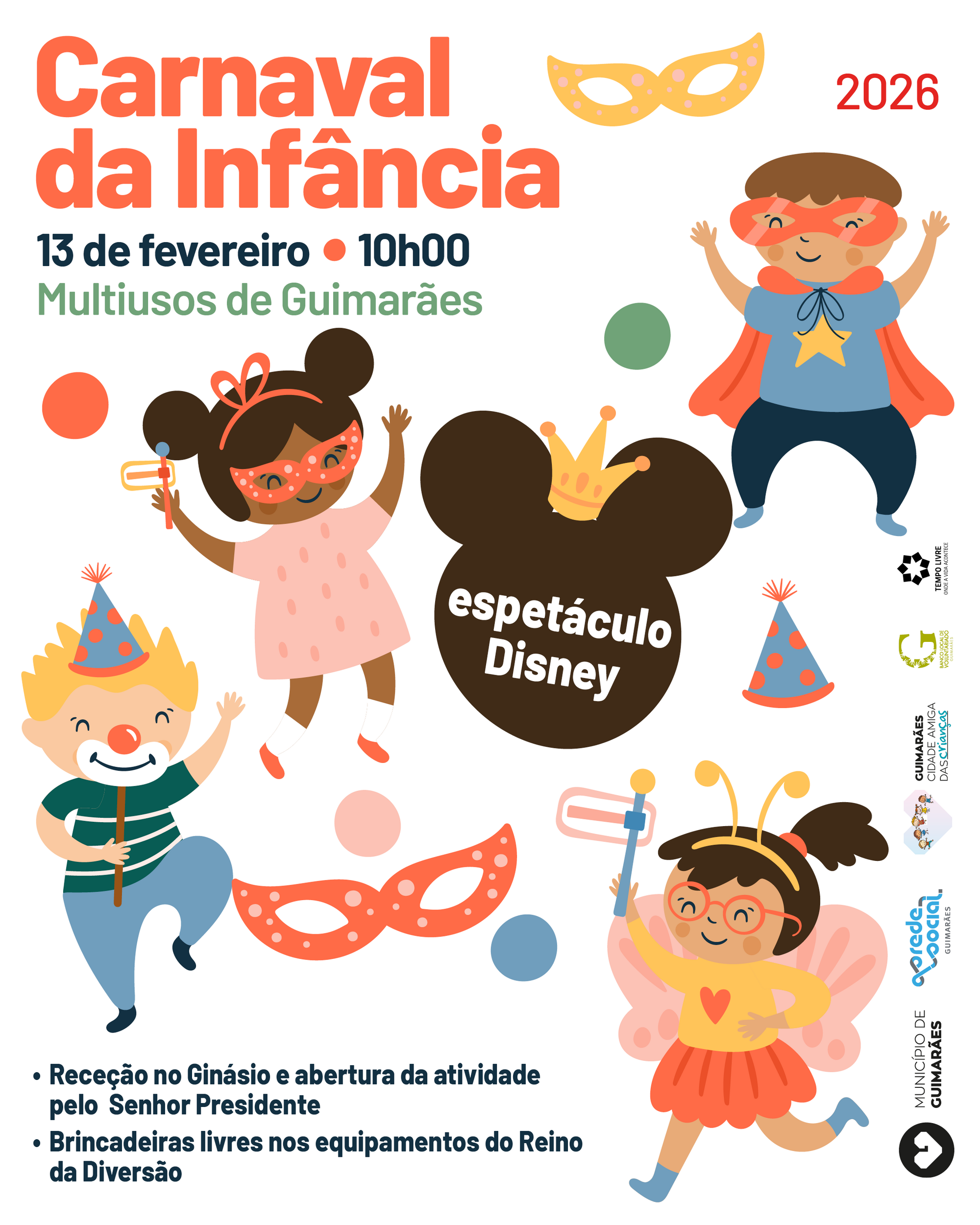 O Carnaval de Guimarães promete ser vivido com entusiasmo por todas as gerações. Depois do Carnaval Sénior, que se realiza esta quarta-feira, será a vez das crianças darem vida à festa, com o Carnaval da Infância, que acontece na sexta-feira, dia 13 de fevereiro, pelas 10h00, no Multiusos de Guimarães.