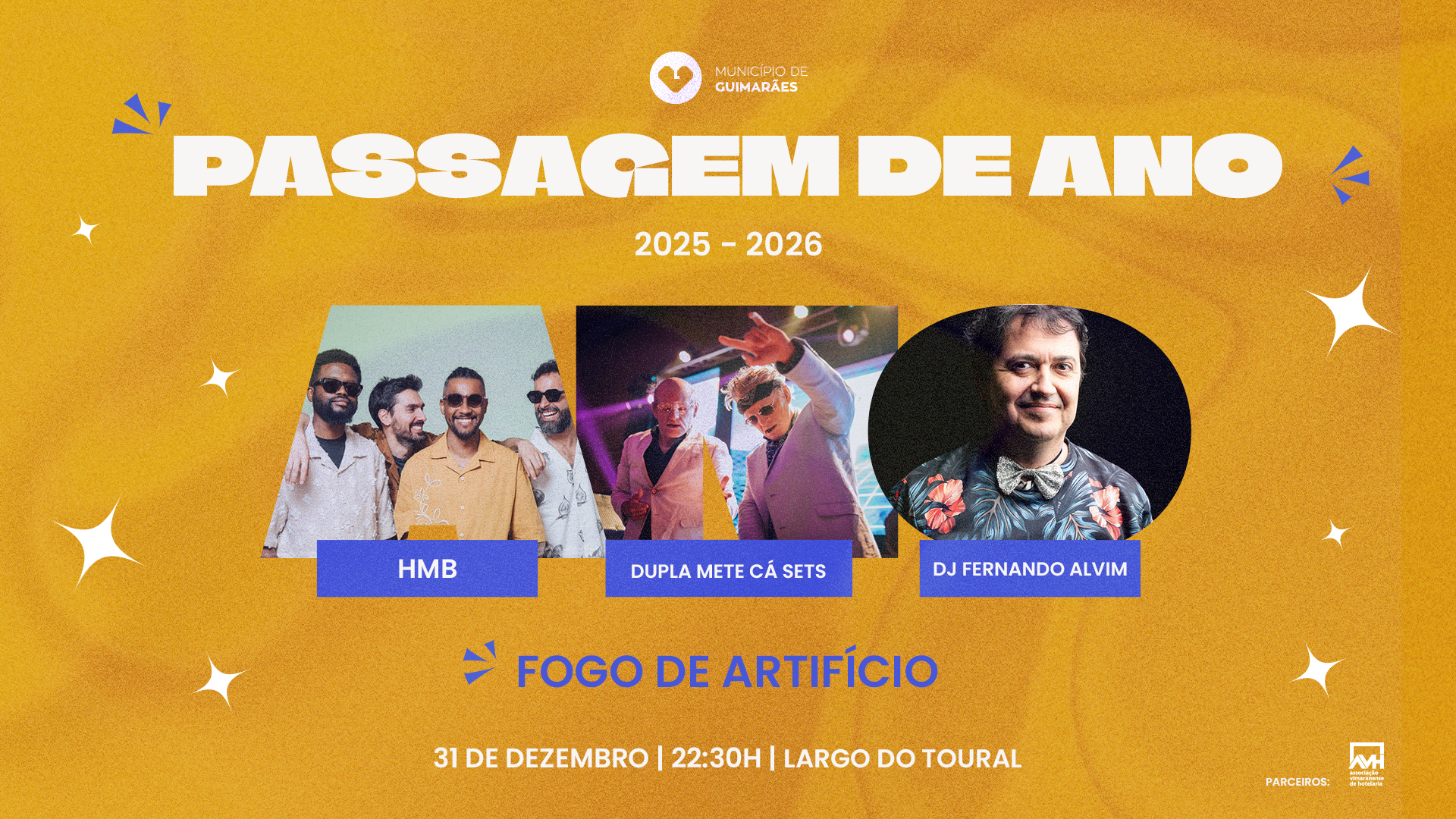 HMB, Mete Cá Sets, ADIAFA, Fernando Alvim, um espetáculo pirotécnico que promete iluminar o céu sobre o Toural e o Concerto de Ano Novo com a Orquestra de Guimarães, são alguns dos destaques do programa preparado pelo Município de Guimarães para assinalar a entrada em 2026 e o início do novo ano.
