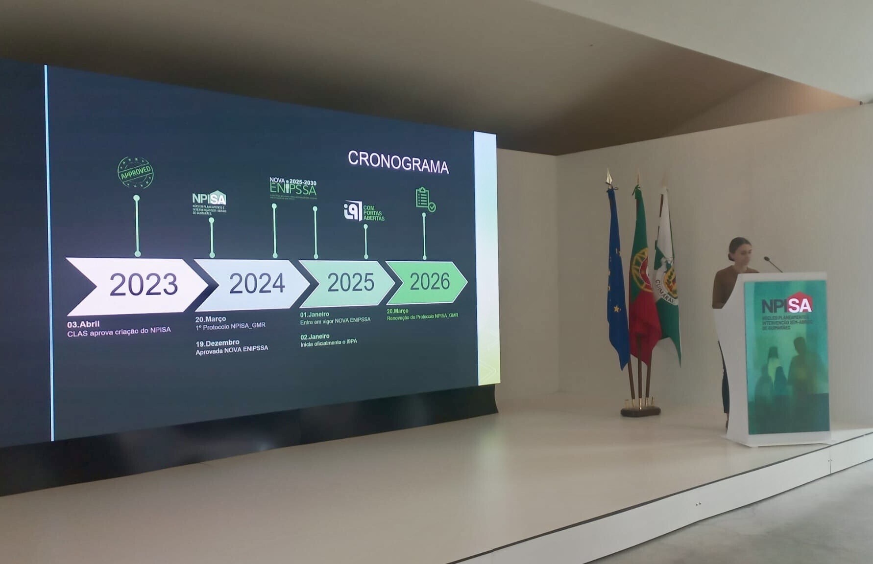Recorde-se que, em 20 de março de 2024, foi firmado o primeiro protocolo com a ENIPSSA 2017-2023, que permitiu implementar o NPISA de Guimarães e consolidar o seu funcionamento, assegurando a elaboração e atualização do diagnóstico local e o planeamento de respostas adequadas à realidade do território. Com a aprovação da nova ENIPSSA 2025-2030, tornou-se necessária a formalização de um novo documento de colaboração, reforçando a continuidade do trabalho desenvolvido.