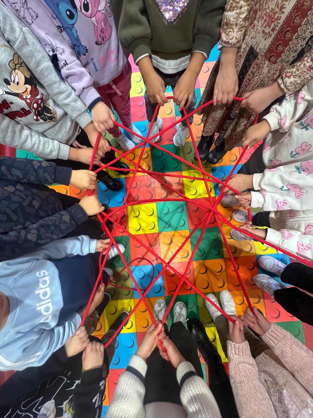 Uma das atividades desenvolvidas evidencia, de forma simbólica e prática, a rede de relações que se constrói no seio do grupo, onde cada criança se encontra ligada às restantes. Esta abordagem reforça a noção de interdependência, o sentido de pertença e a importância do contributo individual para o equilíbrio e sucesso coletivo, sublinhando que o percurso escolar é também um processo partilhado.