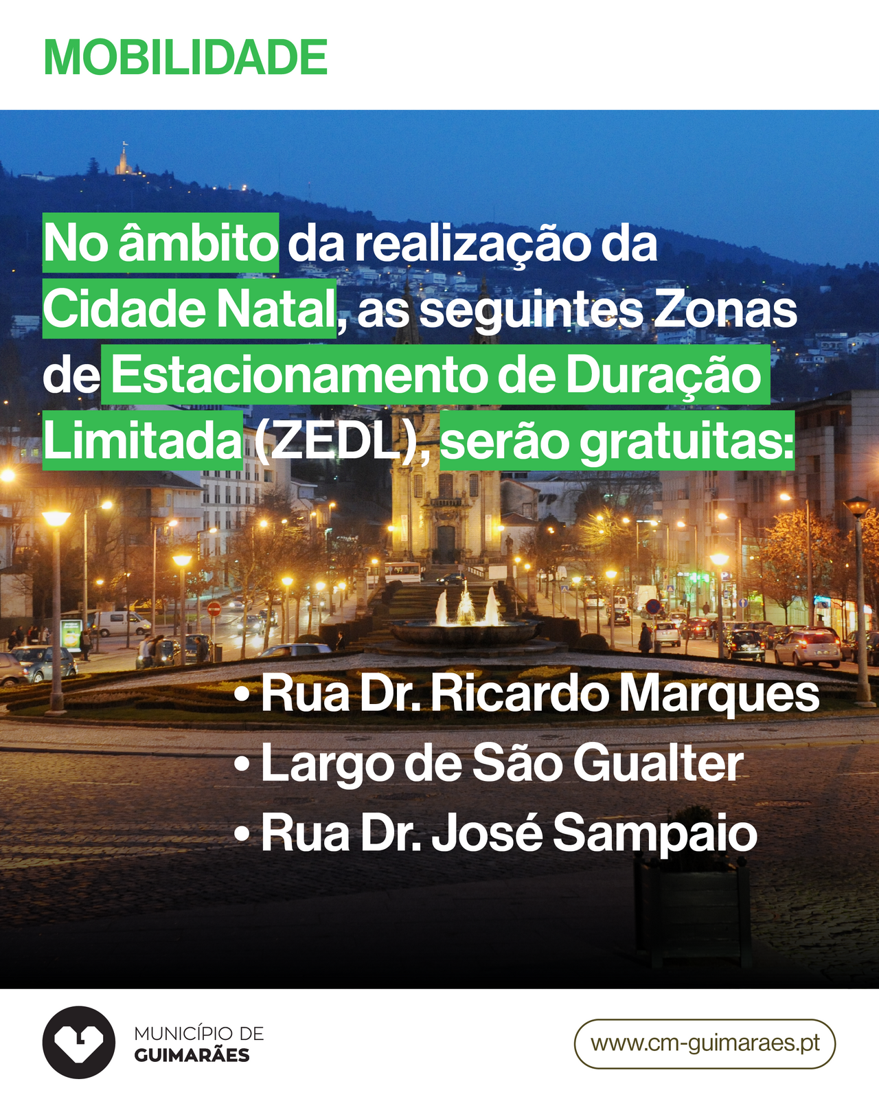 No âmbito da realização da Cidade Natal, informa-se que o estacionamento nas Zonas de Estacionamento de Duração Limitada (ZEDL) — conhecidas como zonas de parcómetros — situadas na Rua Dr. Ricardo Marques, Largo de São Gualter e Rua Dr. José Sampaio será gratuito.